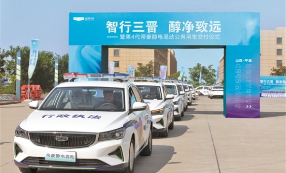 晋中市首批集中交付使用的醇电混动公务用车。 记者 唐伟青 摄 8月31日,“智行三晋 醇净致远”吉利汽车第4代帝豪醇...