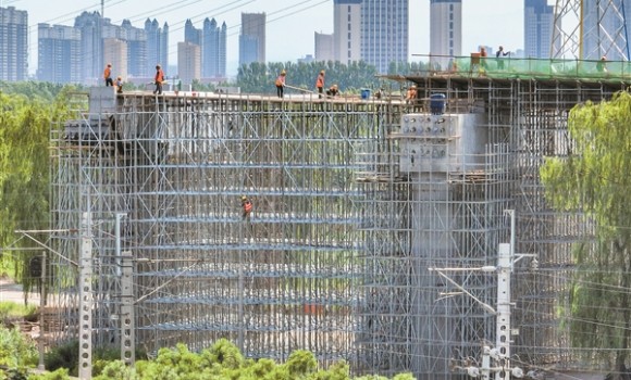 7月13日,在平遥古城生态旅游产业园旅游大道跨越南同蒲铁路转体大桥建设工地,工人正在加紧施工。该项目是连接平遥县城与...