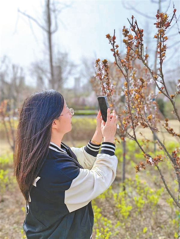 3月25日,游人在介休市北坛公园拍摄盛开的春花。仲春时节,介休市公园、绿地处处鲜花绽放,呈现出“城在花中,人在画中”的迷人景色。 通讯员 曹彩云 范亚明 摄