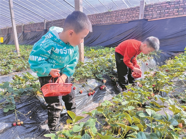上图:静升镇初心家庭农场工作人员在大棚内进行点花授粉。 下图:小朋友提着塑料筐精心挑选成熟的草莓。