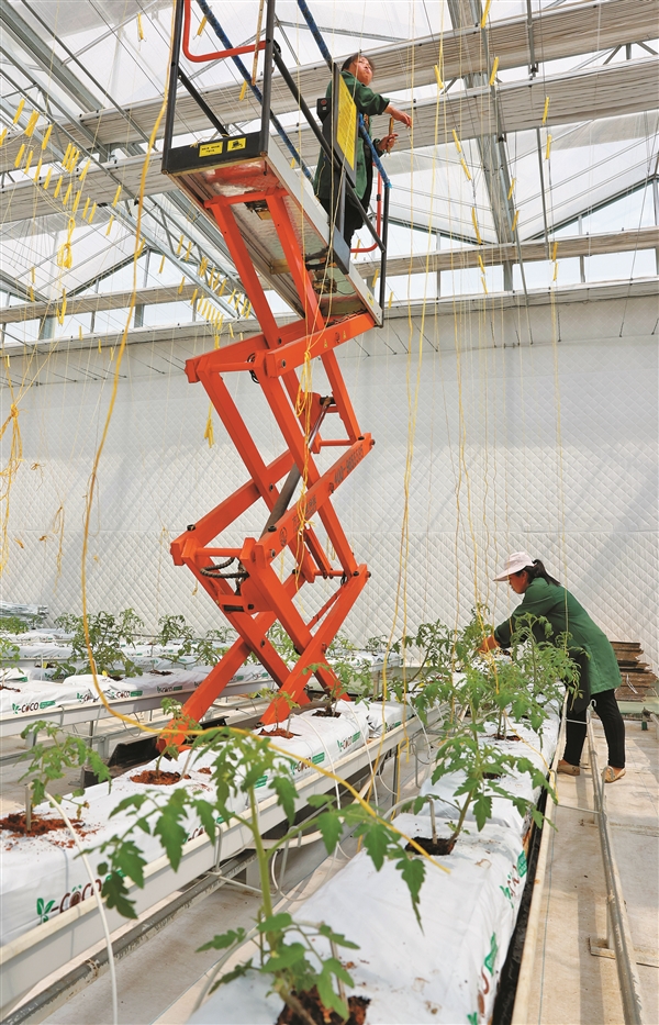 图2:4月2日,技术人员在日光温室内管护果蔬植株。