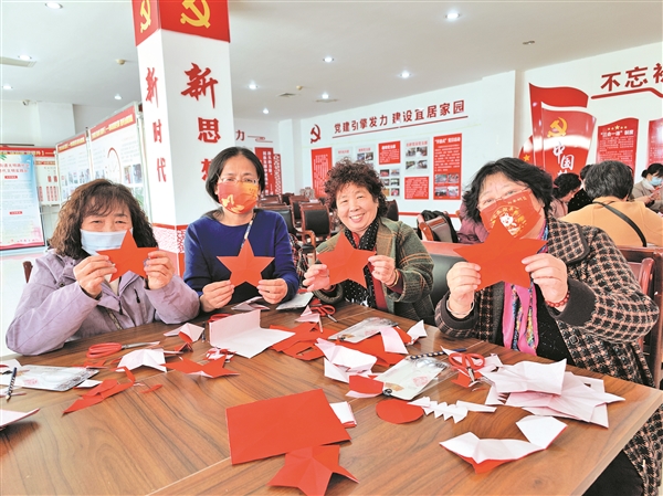 图为剪纸活动现场,杨光伟和社区老人展示剪纸作品。