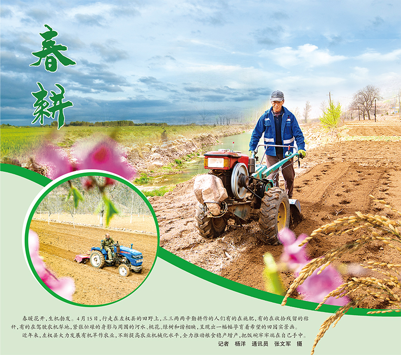春暖花开,生机勃发。4月15日,行走在左权县的田野上,三三两两辛勤耕作的人们有的在施肥,有的在收拾残留的秸秆,有的在驾驶农机犁地,紧张忙碌的身影与周围的河水、桃花、绿树和谐相映,呈现出一幅幅孕育着希望的田园实景画。