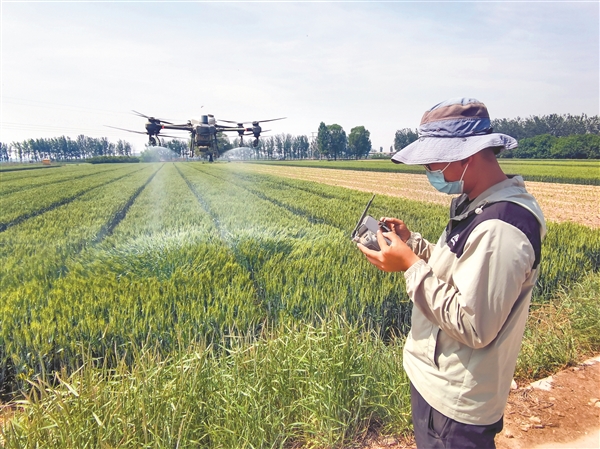 5月23日,祁县昭馀镇北谷丰村的技术人员利用植保无人机喷洒农药。为确保小麦丰产丰收,连日来,祁县各乡镇抢抓晴好天气,利用植保无人机开展小麦病虫害防治作业,通过科技手段助力田间管理,促进农业生产提质增效。 通讯员 张钰佳 摄