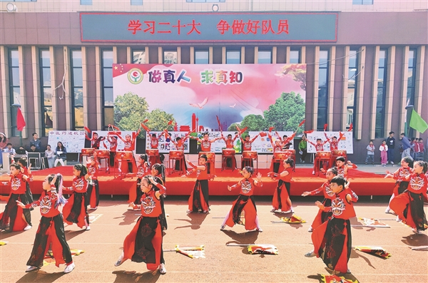 六月一日,榆次区羊毫街小学在“学习二十大 争做好队员”庆“六一”活动中,举行了入队仪式、“六一”表彰、文艺汇演等,通过形式多样的活动厚植学生爱党爱国情怀。图为二年级五班表演的鼓乐舞《中国龙》。通讯员 张 松 摄
