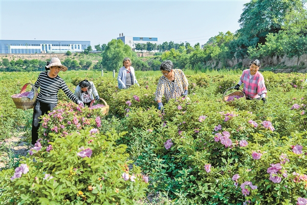 6月13日,平遥县岳壁乡黎基村村民在黎基玫瑰农业生态观光产业园采收玫瑰。近年来,该村大力发展食用玫瑰种植,打造集玫瑰种植、产品加工和旅游休闲于一体的现代化产业,促进集体经济和村民增收,带动当地旅游业发展。