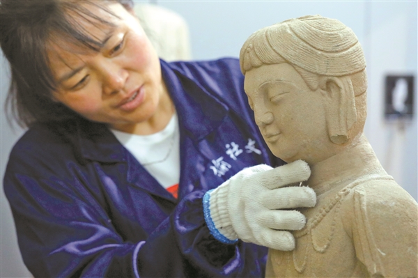 ①榆社县化石博物馆工作人员对石刻进行定期维护。