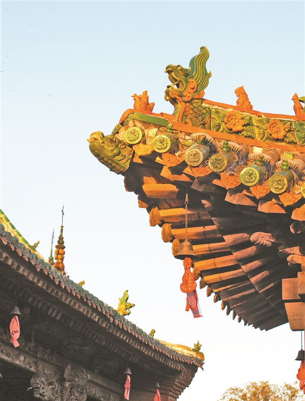 ②介休张壁古堡屋檐布满琉璃雕塑,孔雀蓝釉在夕阳的照射下熠熠生辉。