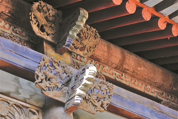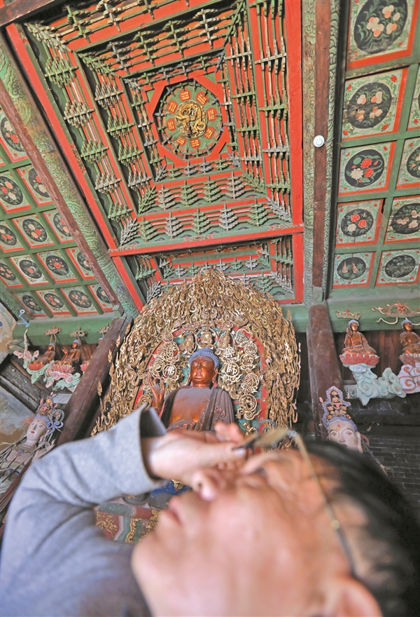 ③在灵石资寿寺,设计奇巧、制作精细、色彩明艳的藻井吸引了游客驻足欣赏。