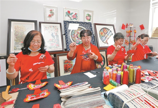 和顺巧英民间绣艺中心内,村民正在认真制作牵绣工艺品。