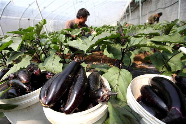 图为3月15日,榆次区东阳镇的蔬菜大棚里,农民在大棚里采摘茄子。
