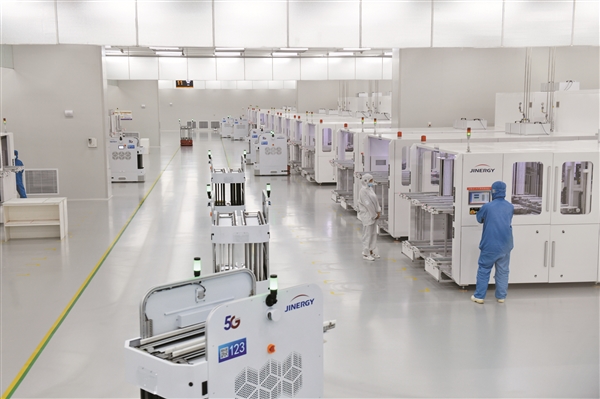 3月18日,晋能光伏智能制造生产线上,5G智能小车正在将硅片供料等转运至生产台上。近年来,晋能科技通过技术革新和精益生产,逐步构建起具有技术和成本竞争力的电池、组件生产能力,销售足迹遍布全球,已向澳大利亚、德国、印度、巴西等50多个国家提供了高效率、高品质的太阳能组件。 记者 杨 洋 摄