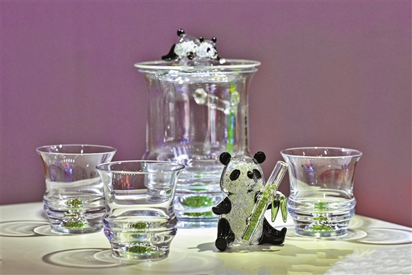 面积约200平方米的祁县玻璃器皿展区,30余家企业的玻璃器皿争奇斗艳。在照泽坊玻璃展区,大熊猫怀抱翠竹憨态可掬的造型受到许多游客的喜爱。来自成都的王女士拿起每个工艺品都爱不释手,直夸太漂亮了!工作人员热情介绍:“本款茶具以熊猫戏竹为创作主题,以国宝大熊猫为主角,以竹节为主体造型,以翠竹和竹笋为装饰,用传统吹制水晶玻璃为载体,是一款很有实用价值的工艺品……”