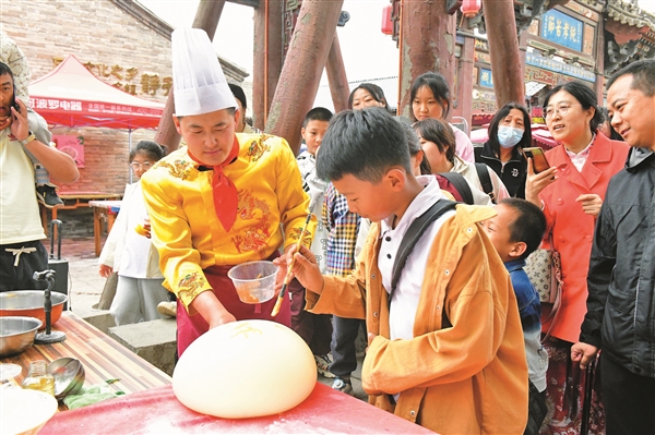 “五一”期间,在静升西街入口处,从王家大院景区尽兴而出的游客,根据路牌的指引可以走进静升西街。上午10点,在西街入口处,大戏台成为吸引游客驻足打卡的第一站。台上,来自县晋剧团的演职人员正在倾情表演,随着乐队的奏响,演员们唱念做打,表演起精彩纷呈的戏曲故事。高亢激昂的唱腔,优美动听的旋律,时而激昂慷慨、时而柔情似水的表演,将观众带入了一个个扣人心弦的故事情境之中,让省内外游客尽情领略晋剧的独特魅力。与此同时,在西街入口的一角,山西面食绝技也吸引了游客的目光,表演者们将刀削面、龙须拉面、扯面的制作技艺展示得淋漓尽致,面食绝技表演“口吹面气球”更是让游客惊叹,游客们纷纷拍照打卡。