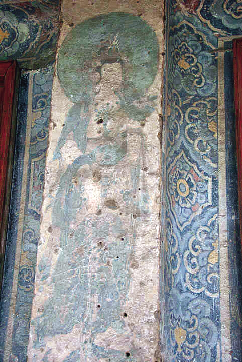 自在观音的左侧是韦驮立像,也是双林寺彩塑中艺术价值最高的一尊,曾被中外专家学者誉为“全国韦驮之冠”,并被载入《中国美术大全》。看他个子并不算太高,1.6米左右,空间虽小、架势很大,他的身体重心立于左足,下肢朝前站立,从腰部开始,由头带动整个身体躯干向右侧扭曲。这种扭曲非常夸张,已经大大超出了人体生理所允许的限度,但这种违反人体解剖结构的动势,不仅丝毫没有一点不舒服的感觉,相反给人一种强大的力度和动势,到达了雕塑作品的最高境界“不动之动”。