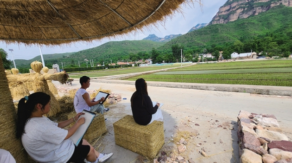 出泽城村,入东安村,俯瞰这里,太行山脉与清漳河、稻田、民居交相辉映,构成了一幅和美乡村田园画卷。近年来,东安村以发展优质水稻产业为龙头,紧抓农旅融合,利用稻草资源建设了稻田公园,吸引了游客和美院师生等前来打卡、写生,为乡村振兴注入了活力。几位正在写生的学生表示:“这里山美、水美、人美,每次来这里写生都能找到不同的灵感。”
