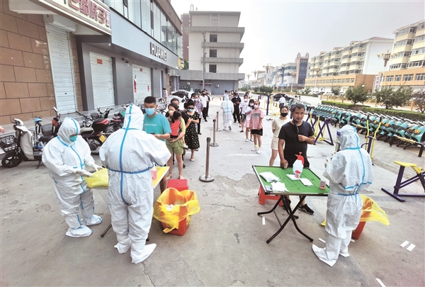 8月21日8时起,太谷区实行临时性全域静态管理,并开展全员核酸检测。图为市民正在有序排队进行检测。孙泰雁 摄