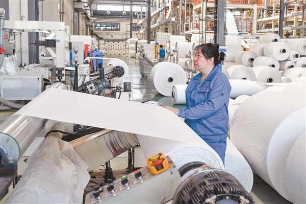5月4日,在山西宇皓环保纸业有限公司生产车间,工人在自动化生产线上加紧生产环保纸订单产品。该公司注重科技创新,不断推进新技术、新工艺、新配方和新装备升级改造,研发生产的不同规格与种类的石头纸赢得了国内外市场的青睐。 本报通讯员 梁生仁 摄