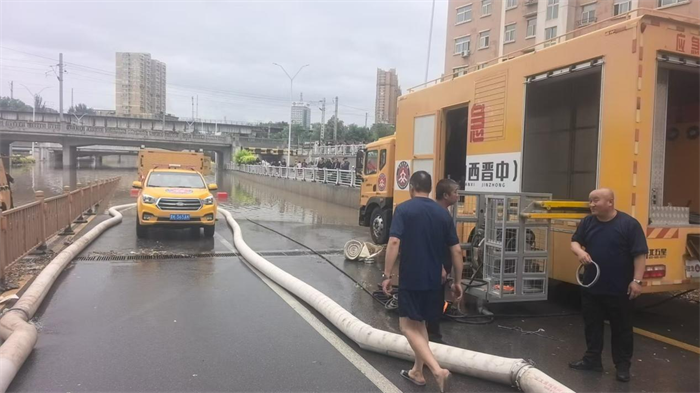 山西科技新闻网晋中讯(李锐娜 陶慧敏 报道 通讯员任艳明)受强降雨天气影响,2025年7月3日上午晋中市榆次主城区多处出现严重内涝积水,接警后救援大队迅速响应,第一时间启动应急预案,拉响事故警铃,紧急调派排涝抢险车7辆、5辆抢险运兵车、山猫装载机一辆、指战员40名、携带潜水泵等排水装备火速赶赴现场进行处置。