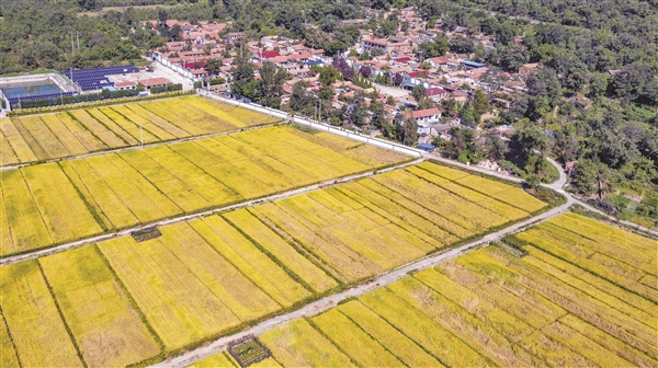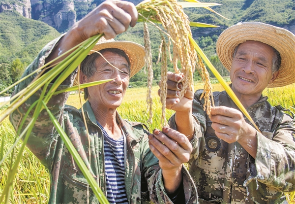 金秋时节,丰收在望。9月21日,左权县麻田镇东安村农民正在金黄的稻田里评估产量。从2019年开始,东安村利用当地丰富的水资源试种水稻,农民收益大增。据测算,今年每亩水稻产量可达1300斤,亩收入2600元,比种玉米增收一倍。