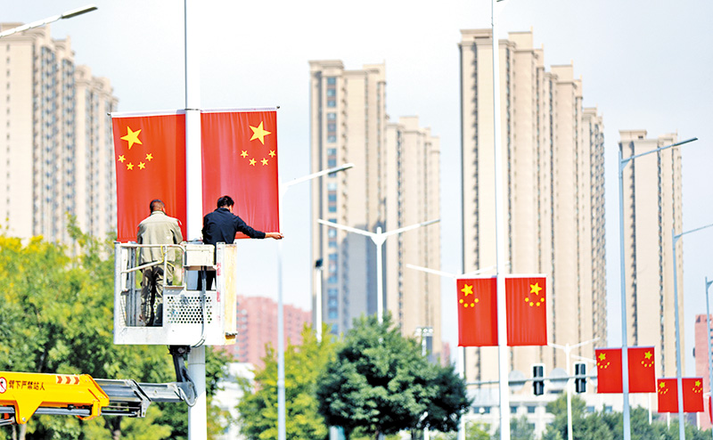 9月24日,在市城区锦纶路,工作人员正在道路两侧悬挂国旗。国庆将至,一面面鲜艳的五星红旗光彩夺目,营造出浓浓的节日氛围。