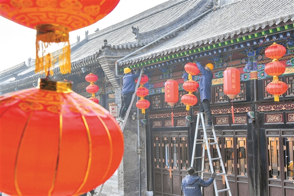 1月5日,工作人员在平遥古城南大街忙碌有序地悬挂红灯笼,一串串红灯笼点缀的街景充满喜庆,也让游客感受到了浓厚的节日氛围。连日来,平遥古城景区加快推进新春氛围营造,为古城市民和各界游客呈献一个欢乐祥和、传统文化浓郁的新春佳节。通讯员 梁生仁 摄