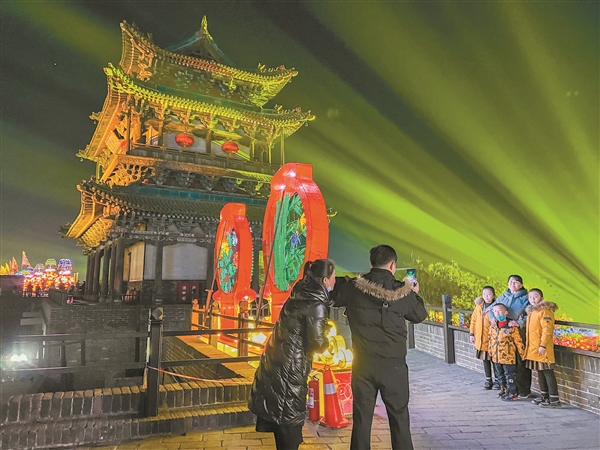 1月29日晚,游客在平遥古城观看3D灯光秀。当晚,平遥古城上演3D灯光秀,与流光溢彩的灯展相呼应,为游客与市民献上展示科技、彰显艺术、传承文化的节日视觉盛宴。