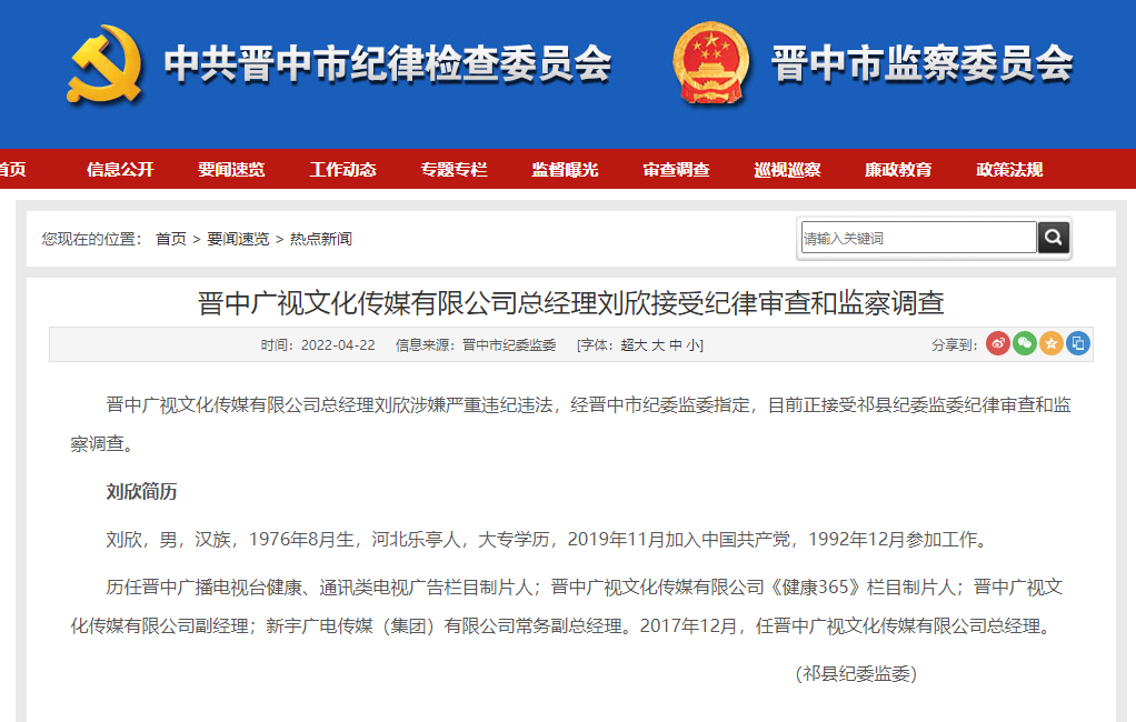 晋中广视文化传媒有限公司总经理刘欣涉嫌严重违纪违法,经晋中市纪委监委指定,目前正接受祁县纪委监委纪律审查和监察调查。