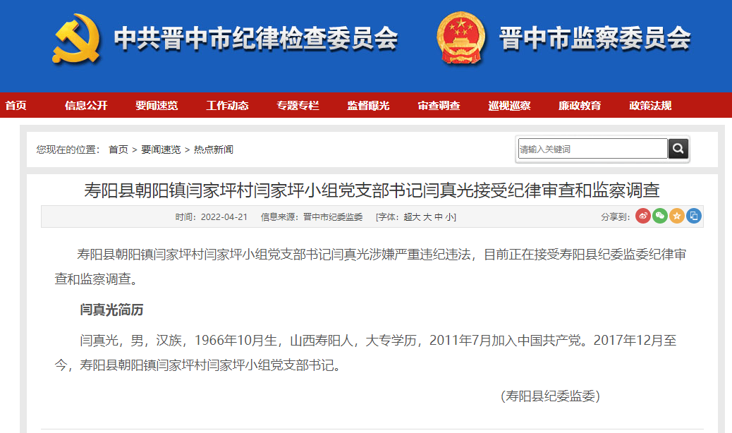 寿阳县朝阳镇闫家坪村闫家坪小组党支部书记闫真光涉嫌严重违纪违法,目前正在接受寿阳县纪委监委纪律审查和监察调查。