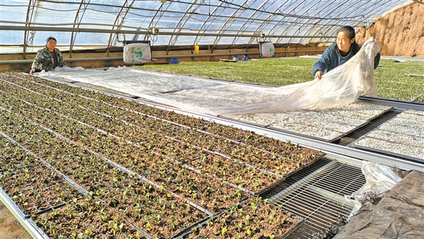 2月2日,在山西巨鑫现代农业园区的西瓜种苗大棚内,管理人员正在为种苗培育床上的幼苗覆盖塑料薄膜。