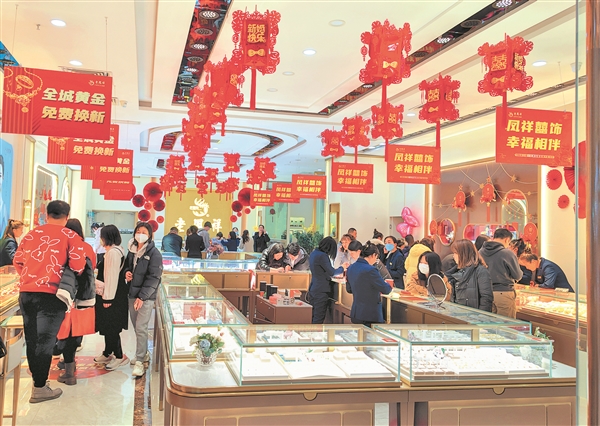 2月12日,记者在市城区某大型商场看到,各金店内人头攒动,金饰销售火爆。随着消费市场复苏,我市各商场客流量、销售额明显增长。