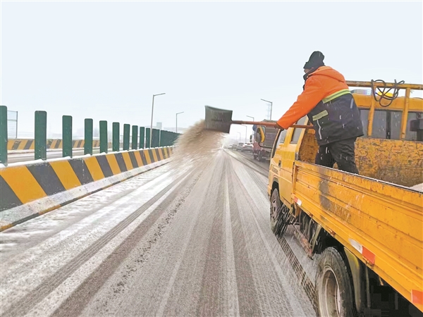 工作人员在省道祁方线城赵立交桥上撒布融雪剂。韩利明 摄
