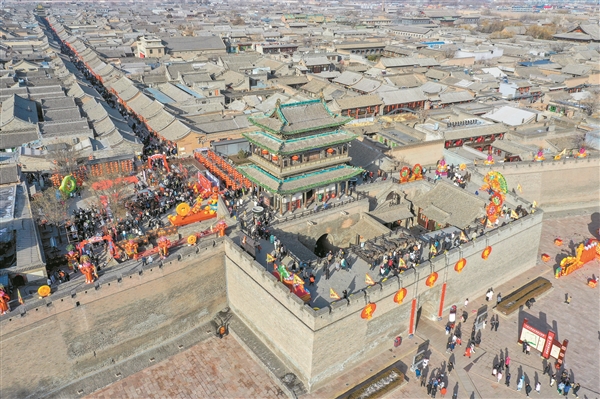 图为今年春节长假期间,平遥古城“平遥中国年”活动吸引中外游客前来“打卡”,景区游客接待量领跑全省景区。